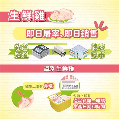 为保障供澳鲜活食品品质安全及货源稳定,一直以来,国家海关总署予以大力支持,持续深化鲜活农产品“绿色通道”机制,而供澳禽肉产品须来源於受内地海关严格监管的禽鸟养殖场及屠宰加工企业,且每批须获发卫生检疫证明书,保障食用安全。为让“生鲜鸡”出厂後能够尽快运抵本澳市场,回应本澳居民食鲜鸡的饮食习惯,粤澳双方协调相关的快速通关及优先检验检疫流程,确保由出厂至到达澳门口岸并完成检疫通关时间控制在1.5小时内,以保障生鲜鸡的品质和卫生。