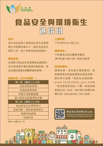 O “Curso Avançado de Segurança Alimentar e Higiene Ambiental” decorrerá nos dias 14 e 15 de Abril das 14h45 às 17h15, na Área do Sector Comercial do Departamento de Segurança Alimentar do IAM, no 1.º Andar do Edifício de Vendilhões do Iao Hon. Além de aprofundar os conteúdos abordados no curso básico, este curso abordará importantes práticas alimentares de segurança que são facilmente esquecidas no trabalho diário, analisando a Lei de Segurança Alimentar, a formulação e implementação de padrões de segurança alimentar e a gestão do rastreamento, dos riscos para a qualidade e de higiene alimentares. Os participantes aprenderão também a detectar sinais da actividade de roedores, bem como medidas a implementar para prevenir e eliminar efectivamente a infestação de ratos e como elaborar planos de contingência para situações como falhas de energia e inundações.