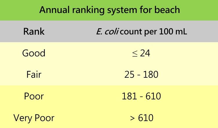 In accordance with all results of the geometric mean of the E. coli counts collected, with reference to the Annual Ranking System of Environmental Protection Department of Hong Kong, the beach water quality are classified into four grades, namely “Good”, “Fair”, “Poor” and “Very Poor” so as to assess the water quality of beaches in the year and offer information about long-term water quality trends.