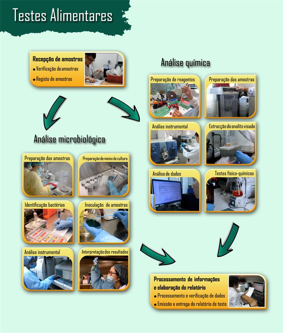 - Testes químicos: Preparação de amostras, Preparação dos reagentes, a sua extracção, análise instrumental, testes físico-químicos, análise de dados.
