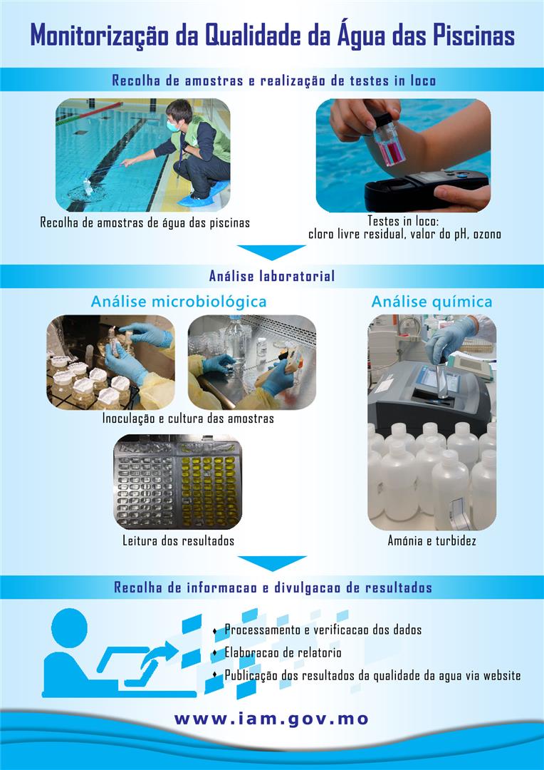 A Divisão Laboratorial deste Instituto monitoriza a qualidade da água constantemente das piscinas públicas geridas pelo Governo, bem como piscinas privadas abertas ao público, nomeadamente, dos hotéis e das habitações. Segundo os itens da monitorização da qualidade da água conforme as "Orientações de higiene nas piscinas artificiais" dos Serviços de Saúde, recolhe periodicamente amostras de água que são sujeitas a análises bioquímicas segundo padrões internacionais, a fim de conhecer o estado sanitário geral da água das piscinas, assegurando a saúde dos banhistas.