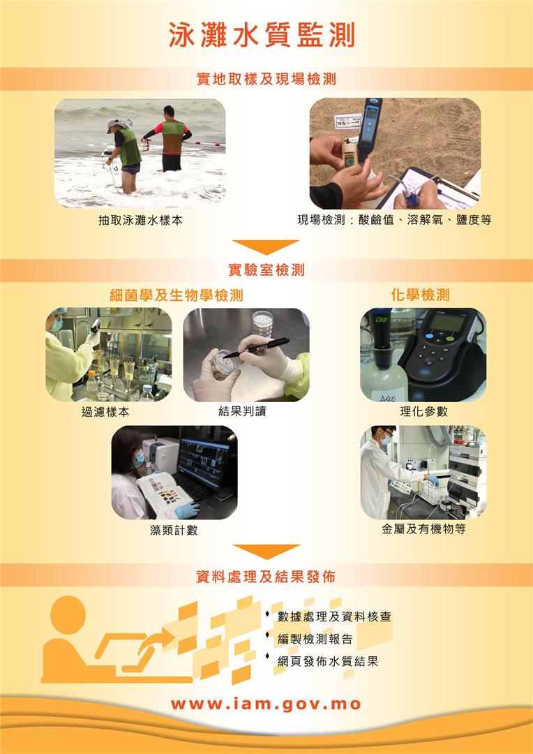 定期於两个泳滩之监测点抽取水样本,在进行酸硷度、溶解氧、盐度等现场检测後,样本尽快送至实验室进行细菌学、化学及生物学等实验室分析。於泳季期间将增加抽样检测频率。