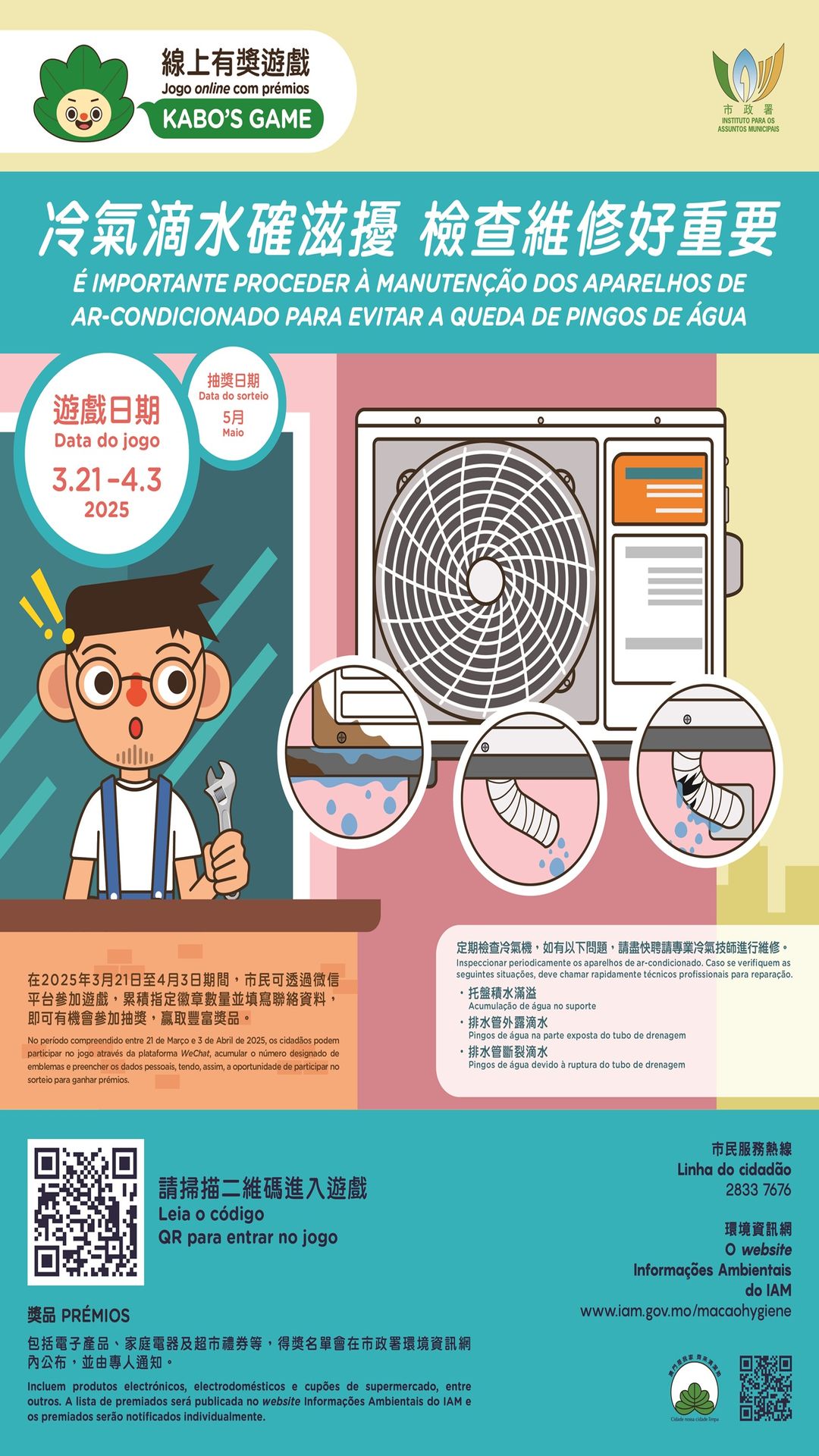 为进一步加强向居民宣传相关资讯,市政署推出了“冷气滴水确滋扰 检查维修好重要"线上有奖游戏。居民可透过扫描宣传海报内的二维码或浏览市政署环境资讯网 www.iam.gov.mo/macaohygiene 参与游戏,累积指定徽章数量并填写联络资料,即有机会参加抽奖,赢取丰富奖品。得奖名单将於五月在环境资讯网内公布,并会有专人通知得奖者获奖事宜。